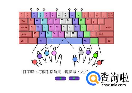 整个手指的指法如下图所示。打字的时候要凭手指的触觉来敲打键盘,而不要使用眼睛来看键盘。