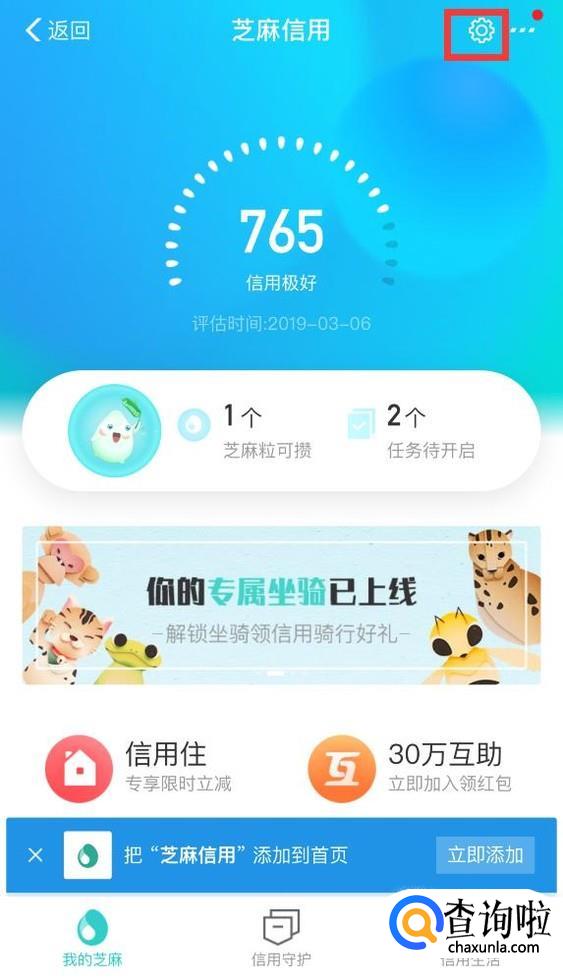 在芝麻信用中,点击右上角齿轮状图标,进入信用管理页。