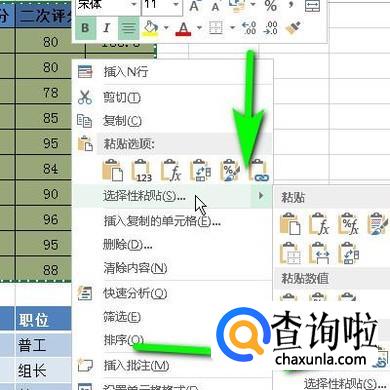 鼠标再次放在表格上,再右击,弹出菜单,鼠标放在“选择性粘贴”这里,弹出子菜单,再选择:图片;如图所示。