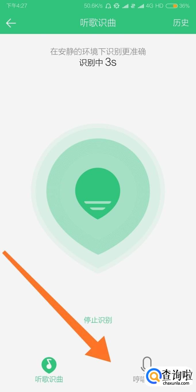 进入“听歌识曲”页面后,只需要把手机麦克风对准音乐声音来源的位置,软件就会自动分析周围的声音。如果没有正在播放的音乐,还可以选择哼唱识别。
