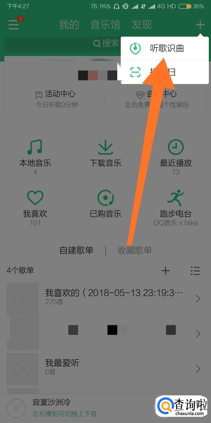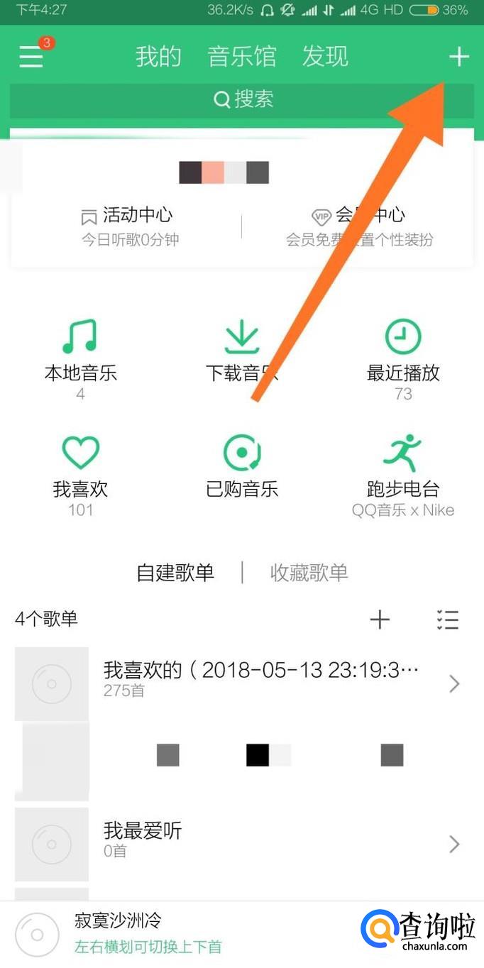 首先进入QQ音乐,点击屏幕右上角的“+”号。