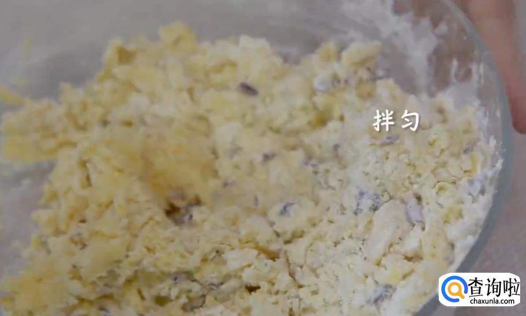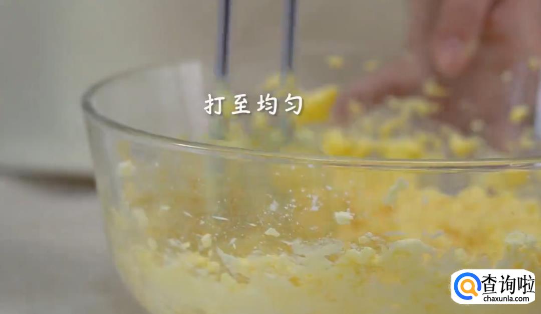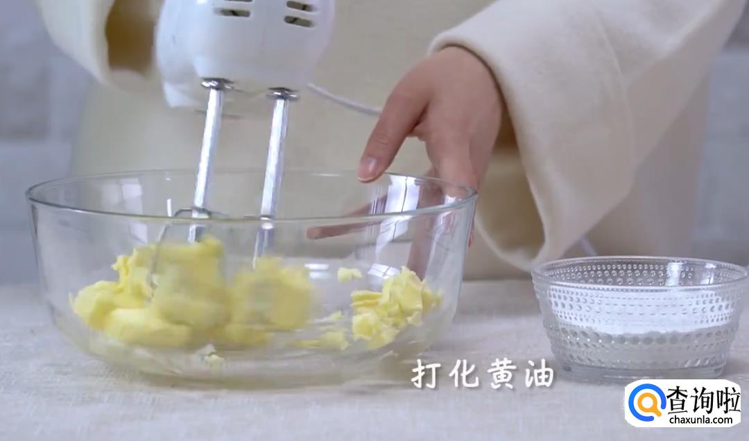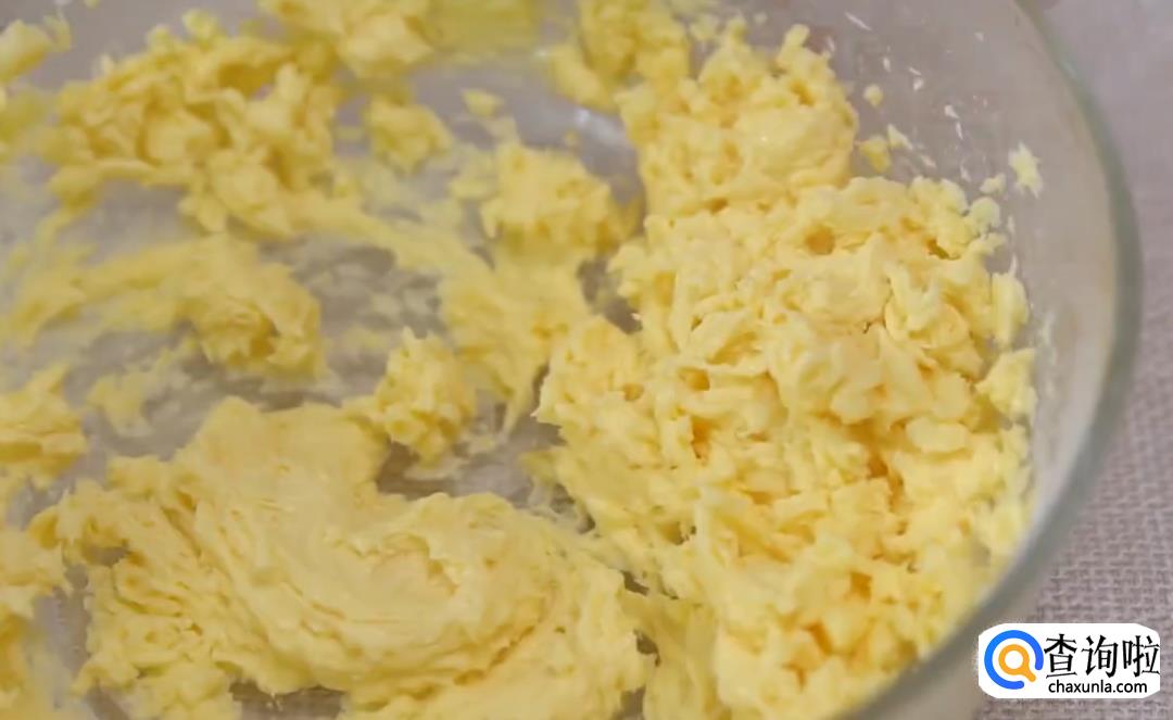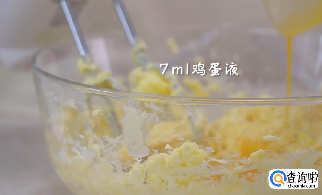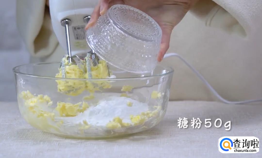 将黄油放入碗中,先用电动打蛋器将其打化;加入糖粉50克,用电动打蛋器将黄油和糖粉打匀至完全融合;再分两次加入鸡蛋液(每次7ml),每加一次都要用电动打蛋器打至均匀。