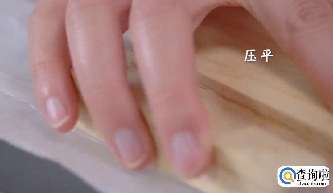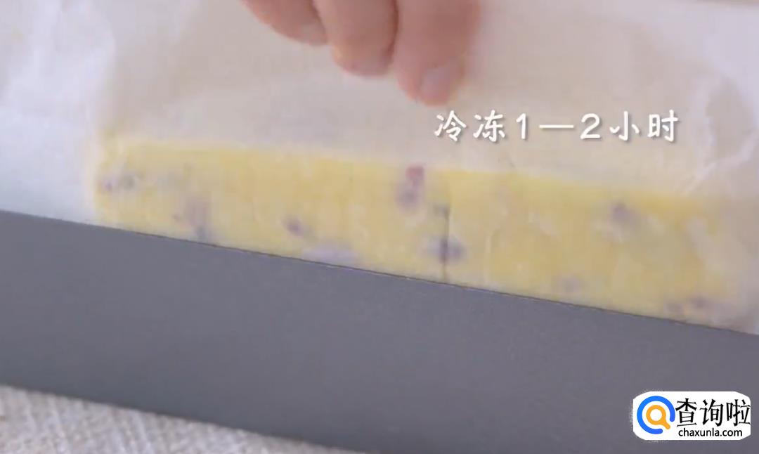 取一半原味面团装入提前放好烘焙纸的模具中塑形、压平,取出放入冰箱中冷冻1-2小时。