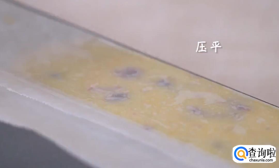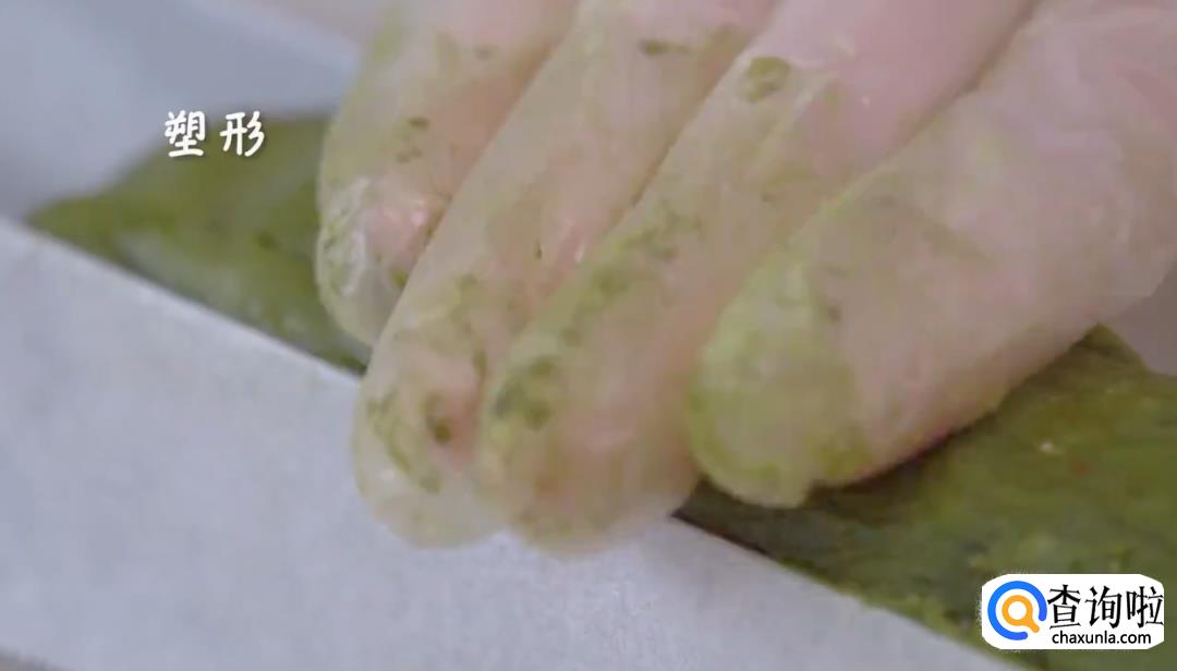 接下来做抹茶味的:在另一半原味面团中筛入抹茶粉揉匀;揉匀后放入提前放好烘焙纸的模具中塑形、压平,取出放入冰箱中冷冻1-2小时。