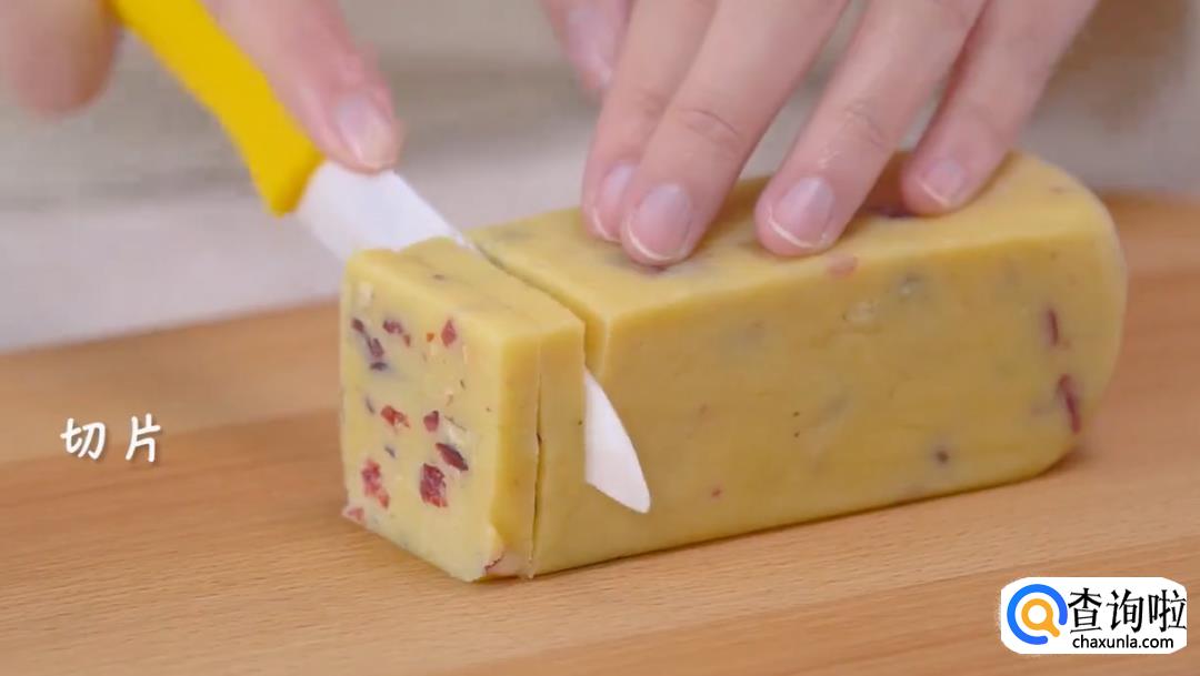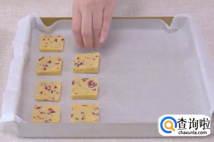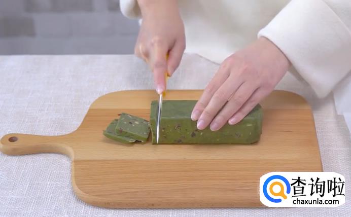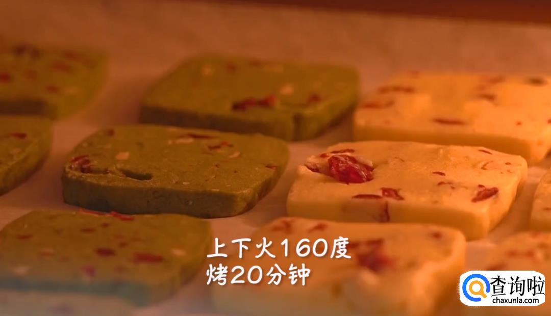 冷冻时间到后,将原味面团和抹茶味面团从冰箱中拿出来,室温缓几分钟,切3-5毫米片;切好摆盘,送入提前预热好的烤箱;用上下火160度烤20分钟。