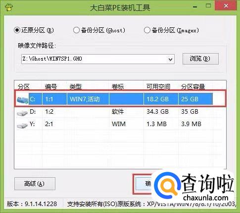 等待大白菜PE装机工具提取所需的系统文件后,在下方选择一个磁盘分区用于安装系统使用,然后点击“确定(Y)”进入下一步操作。