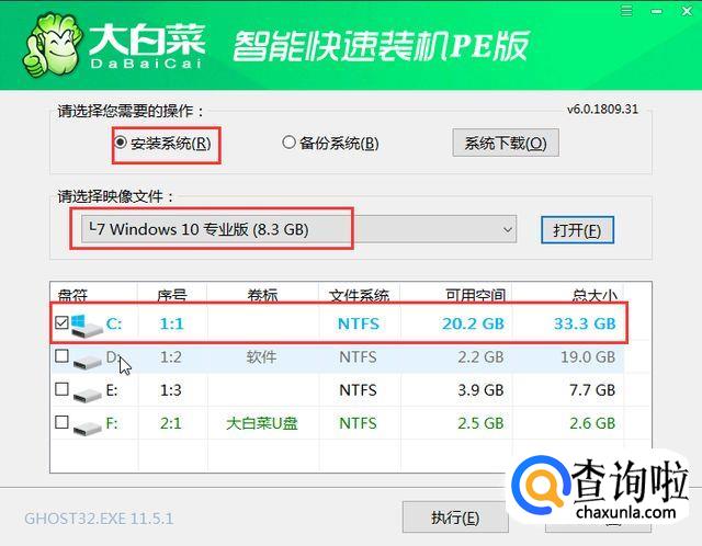 打开大白菜装机软件,在“映像路径”中选中镜像文件并选择win10系统安装位置,通常情况下都是C盘,最后点击“执行”。