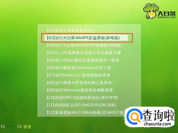 u盘启动进入到大白菜主菜单界面,选择“【02】运行大白菜Win8PE防蓝屏版(新电脑)”回车确认。