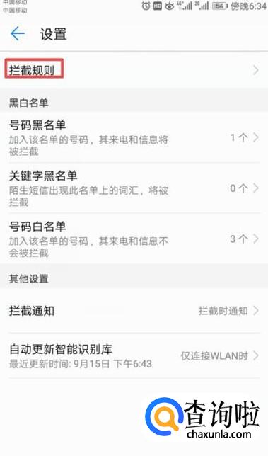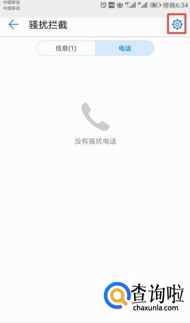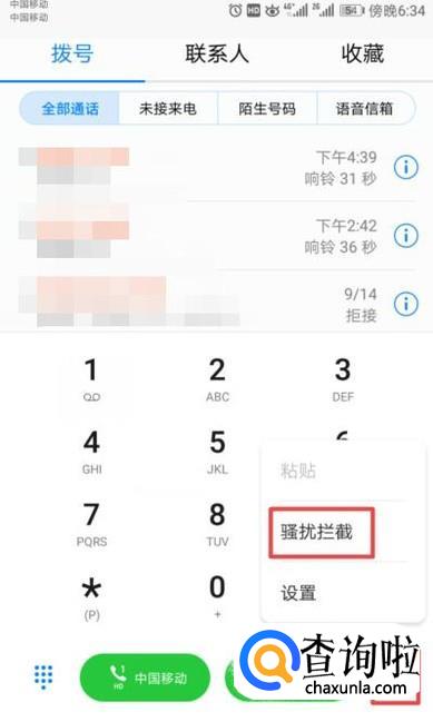 弹出的界面,我们点击右下角的按钮,弹出的界面,我们点击骚扰拦截;