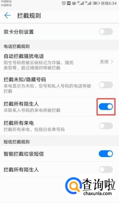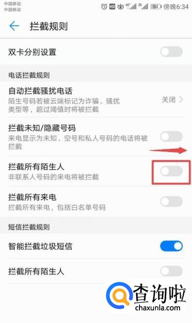 弹出的界面,我们将拦截所有陌生人的开关向右滑动;