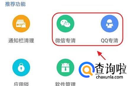 此外它最大的亮点在于专清功能,顾名思义,就是可以专业清理某类APP里面的垃圾,比如下图所示的微信专清和QQ专清,这些聊天软件可以说是积累垃圾最多的应用了;