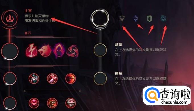 符文副系的搭配是你选择完一大流派之后剩下的四大流派进行选择,也是根据英雄的特性。