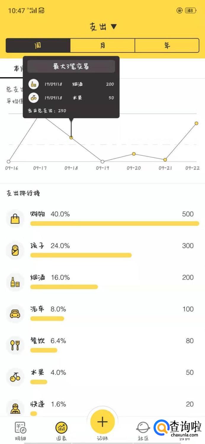 图表这里也有周、月、年的的支出排行榜也比较清楚明了。