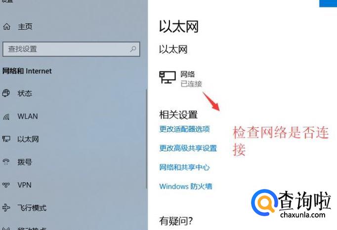 首先要检查的就是网络连接了,在win10中我们需要打开以太网连接,查看连接状态是否正常,如下图所示