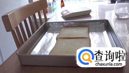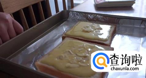 在烤盘中放入吐司,将奶酪糊涂在吐司上。可根据口味再加上杏仁片等。