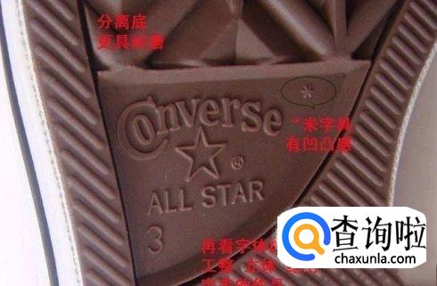 验证方法:CONVERSE正品大底用指甲刮绝不掉色,尽管已有高仿大底不掉色,但绝大部分仿品大底用指甲刮掉色。鞋底穿着的感觉是不同的!高仿偏软,一压一个坑的感觉。正品有些略微偏硬。高仿穿了一天便出现、亮棕色的划痕,及其不耐磨!含胶量足够的鞋底会是浅棕色的,含胶量达不到标准的假货,不会呈现这样的浅棕色。另外鞋底会有四个防伪点,当然它们不仅仅是防伪点,还是工人贴鞋头围条的对照点,内侧围条对应着内侧的第二个防伪点,外侧围条对应着外侧的第一个防伪点。