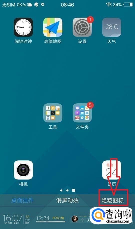 首先在手机桌面的空白地方用手指触摸并停留几秒,或者轻点一下手机左下角的菜单键,但是左下角的菜单键按的时间不能过长,否则会将小V唤醒。
