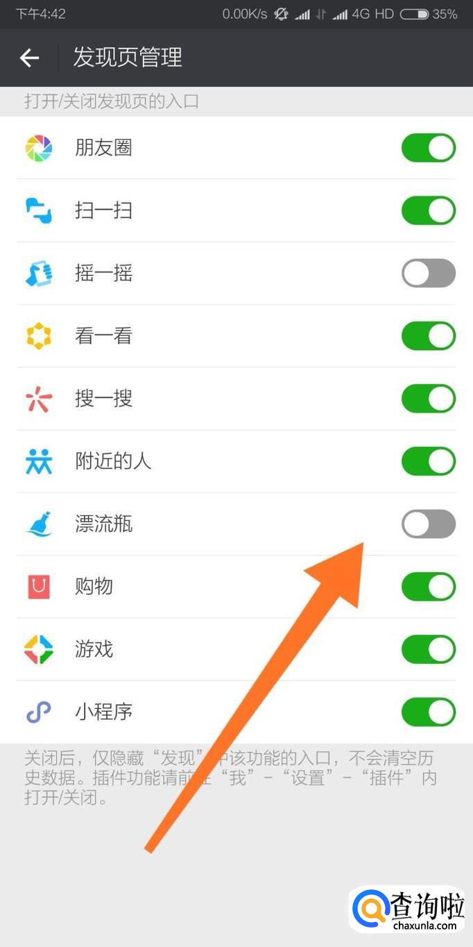 最后关闭“漂流瓶”的功能入口选项即可。