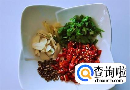 然后把辅料准备好,葱、生姜、花椒、干辣椒等,把大葱切成片状,生姜和干辣椒切成丝状,装在碗里做备用。