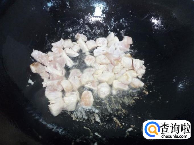 锅里放入少量的油加热,油热后放入腌制好鸡胸肉滑炒,炒至鸡胸肉颜色变白,盛出备用。