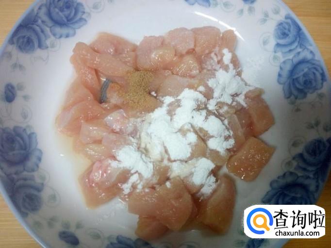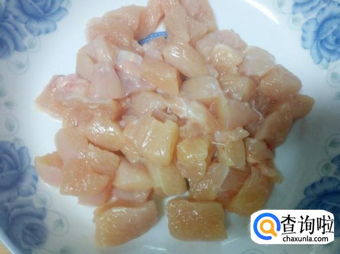 鸡胸肉用水清洗干净,控干水分,切成丁。放入少于盐,五香粉,料酒,淀粉,用手抓匀,腌制15分钟。