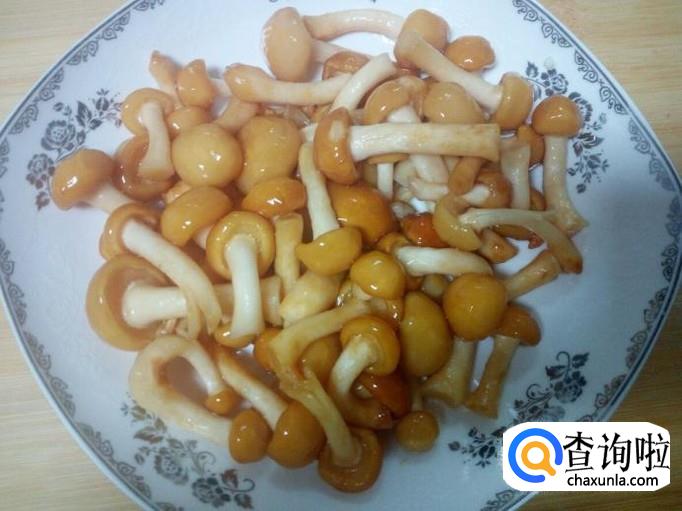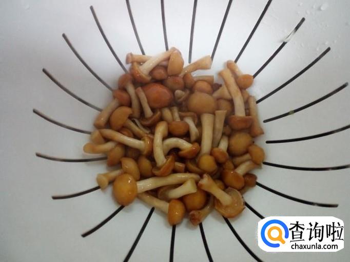 滑子蘑用水焯一下,水开后入锅10秒钟捞出,迅速用冷水过凉,沥干水分。