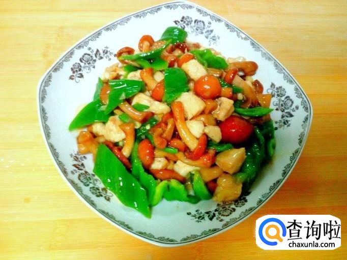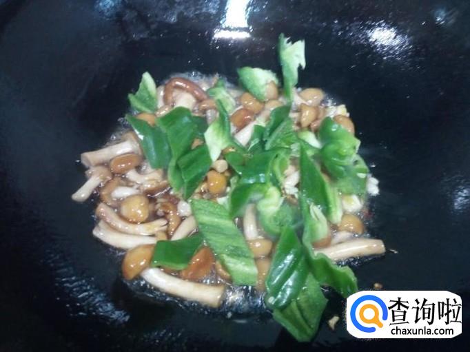 滑子蘑稍翻炒一下,随即放入青椒翻炒,炒至青椒断生,放入炒好的鸡胸肉,放入盐。