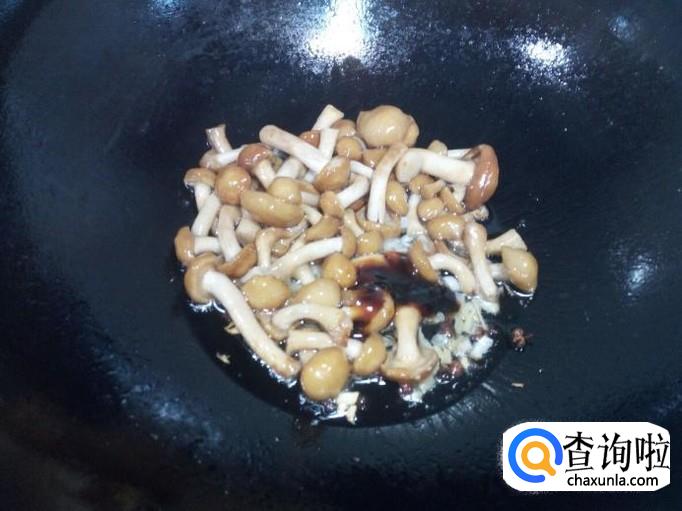 锅内重新放入油加热,油热后放入花椒,葱,姜,蒜,爆锅。放入滑子蘑翻炒,放入料酒,蚝油。