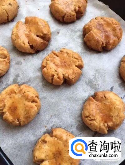 然后我们用手指头把小球压扁,刷一层鸡蛋液放入烤箱,上下火180度烤15分钟
