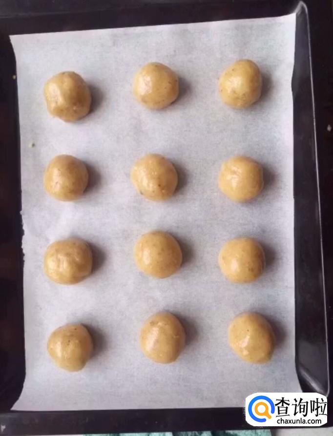 然后我们将面团搓成长条,切成小块,揉成一个个的小球,放入烤盘中(烤盘上面放一层吸油纸)