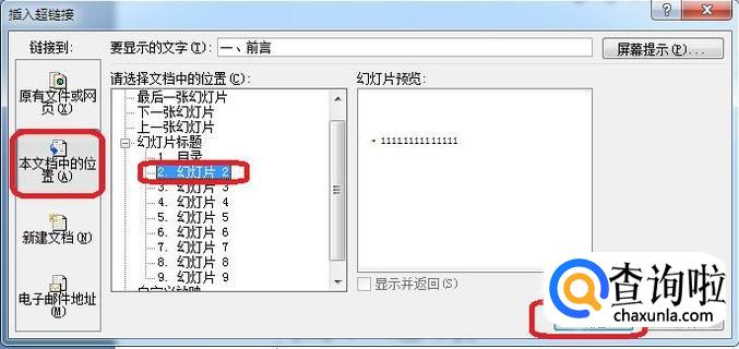 出现“插入超链接”选项框,点击链接到“本文档中的位置”,然后选择需要链接到的幻灯片位置,比如我选择“幻灯片2”,点击确定。