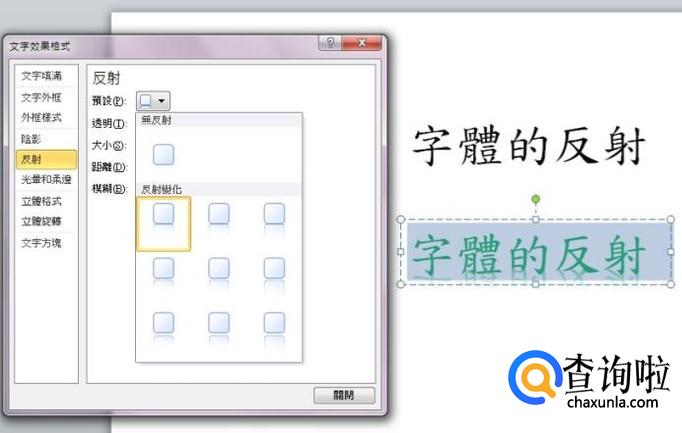 首先,选取需要反射的字体,右击,选择"文字效果格式",然后选择"反射",最后通过调整反射类型、反射大小、反射距离等来达到不同的字体反射效果。 - 011