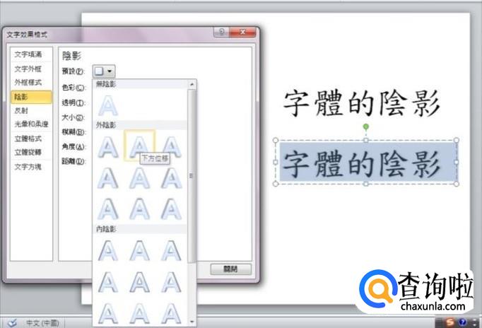 首先,选取需要添加阴影的字体,右击,选择"文字效果格式",然后选择"阴影",最后通过调整阴影类型、阴影大小等来达到不同的字体阴影效果。 - 07