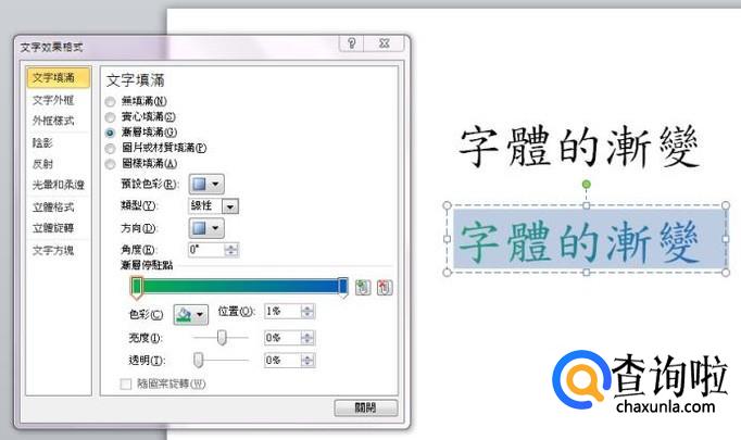 首先,选取需要渐变的字体,右击,选择"文字效果格式",然后选择"文字填满"中的"渐层填满",最后通过选择渐变类型、渐变方向、渐变角度、停驻点位置及颜色等来达到不同的字体渐变效果。 - 05