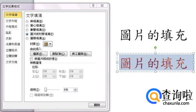 首先,选取需要填充图片的字体,右击,选择"文字效果格式",然后选择"文字填满"中的"图片或材质填满",最后可以选择本地图片或者系统中不同的材质来填满字体。 - 09