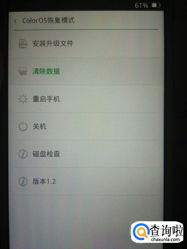 之后就会进入“ColorOS恢复模式”,在其中我们选择“清除数据”,这样我们手机里的数据都会被清空,这样我们的密码也就没有了。
