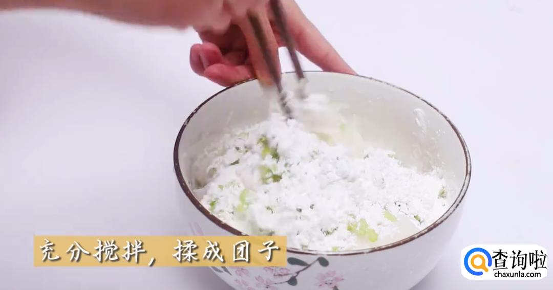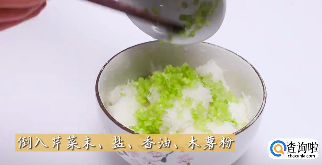 往碗里倒入切好的芹菜末、盐、香油和木薯粉,然后充分搅拌。