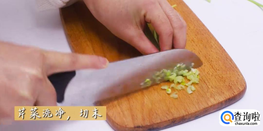 将芹菜和葱都洗干净,芹菜切成末,葱切成葱花。