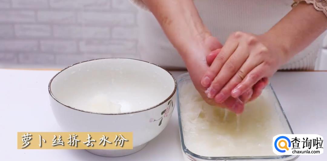 把切好的萝卜丝去除水分,装进碗里。