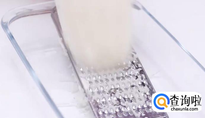 接着,把白萝卜洗干净,剥掉皮,用专门的工具将白萝卜锉成萝卜丝,当然你也可以自己切。