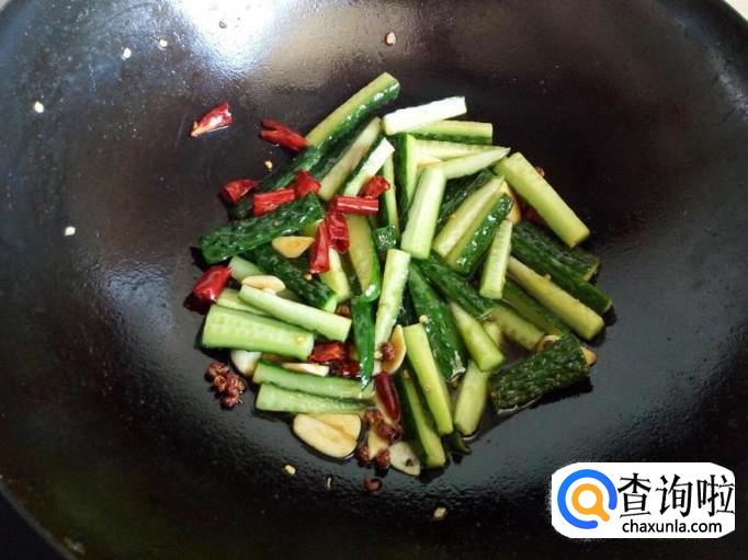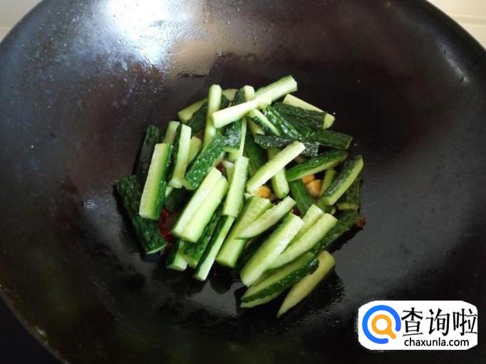 然后把切好的黄瓜条放入锅中,稍翻炒一下(10秒钟),关火即可。