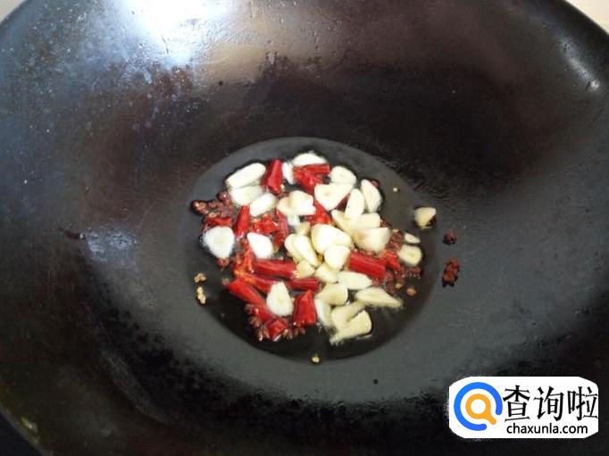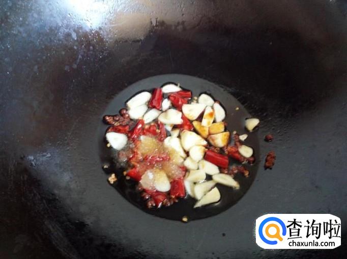 再放入红干椒,蒜,爆香。放入料酒,白糖,少许酱油。