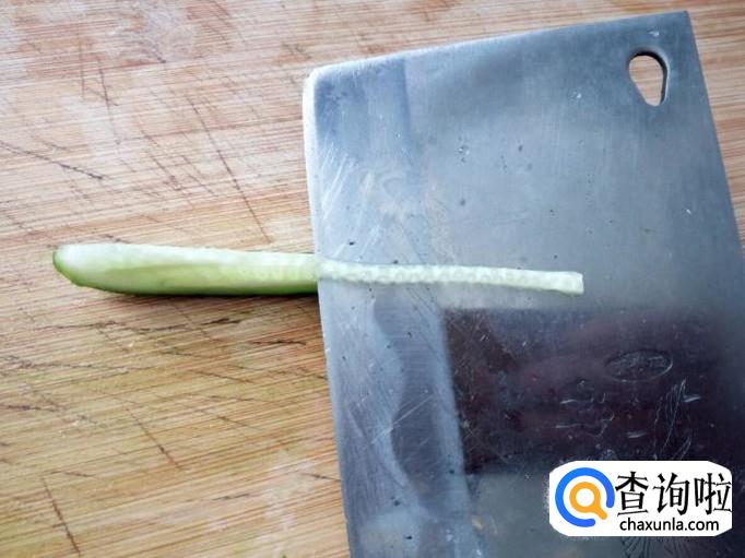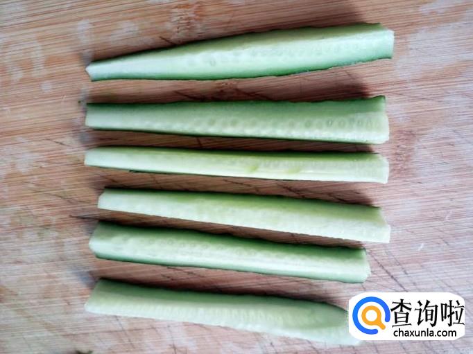 黄瓜用水清洗干净,控干水分,切成条。用刀把黄瓜籽部分去除,避免下汤。