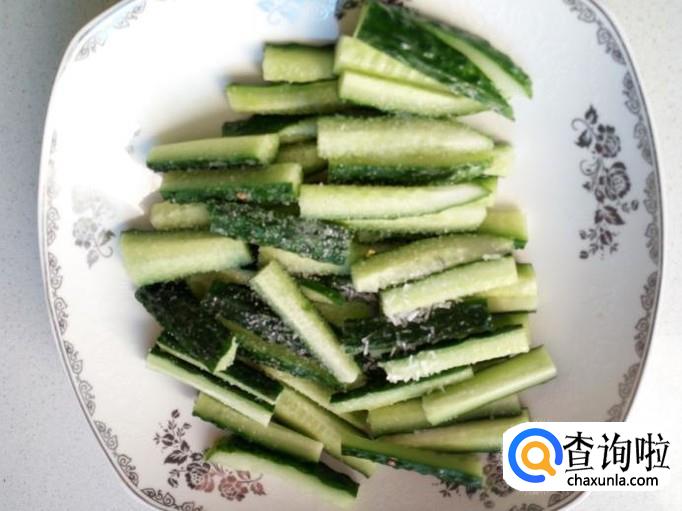 然后把黄瓜条切成段,放入盐,味精,拌和一下。