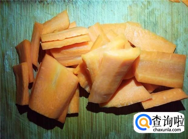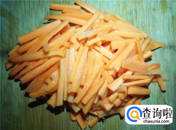 胡萝卜削皮,先切成薄片,再切成细细的丝状,不要切太粗,切太粗不容易炒熟哦。