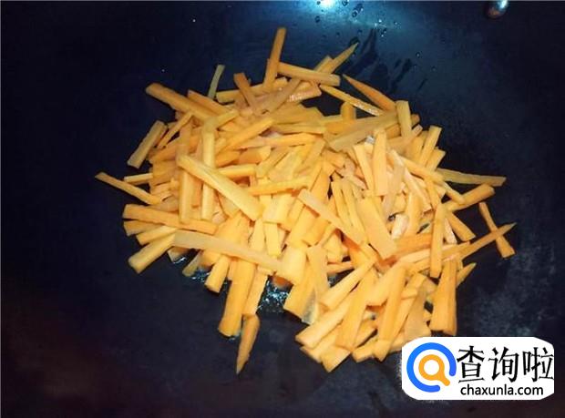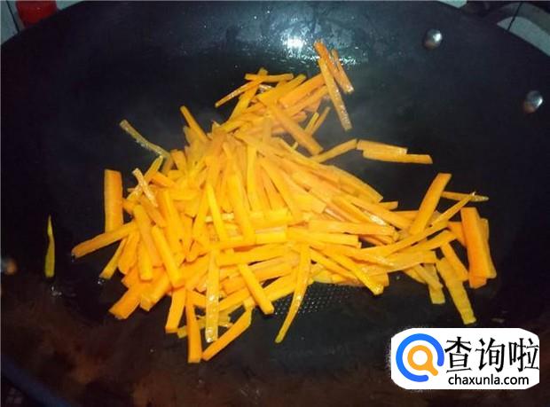 热锅下油,油烧热后,加入胡萝卜丝,洒少量的水,翻炒均匀。
