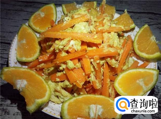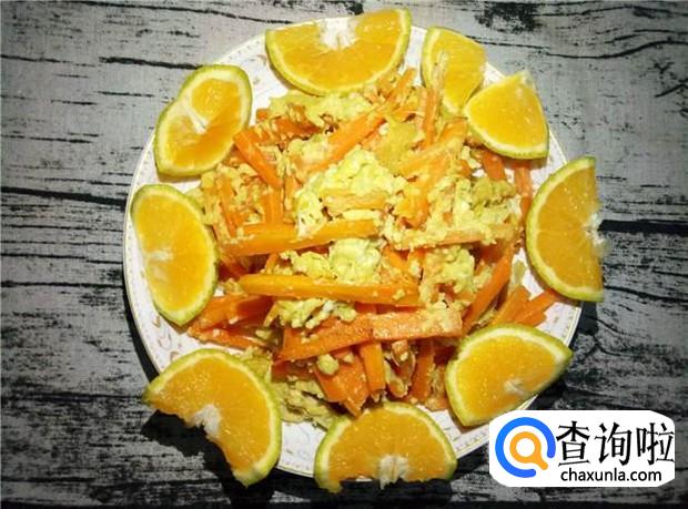 把胡萝卜丝和土鸡蛋装盆子里,盆子周边摆上橘子,作为装饰,这样一道美食就制作完成了。