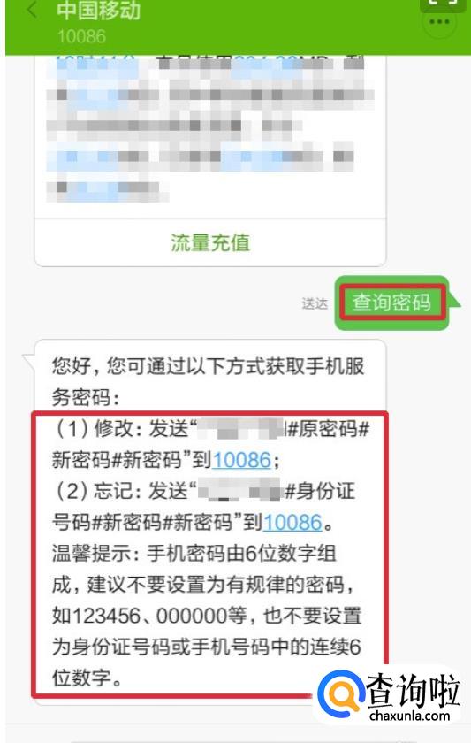 我们可以直接给中国移动客服发送“查询密码”,接着我们就会收到对方回复的操作方法及步骤了。