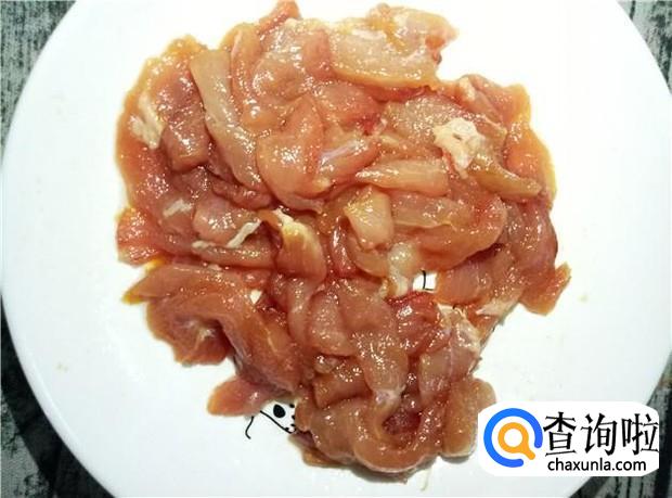 瘦肉切成薄片,加入适量的花生油、盐、酱油,提前腌制好。