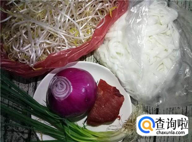 河粉、绿豆芽、洋葱、瘦肉、香葱、花生油、酱油、盐